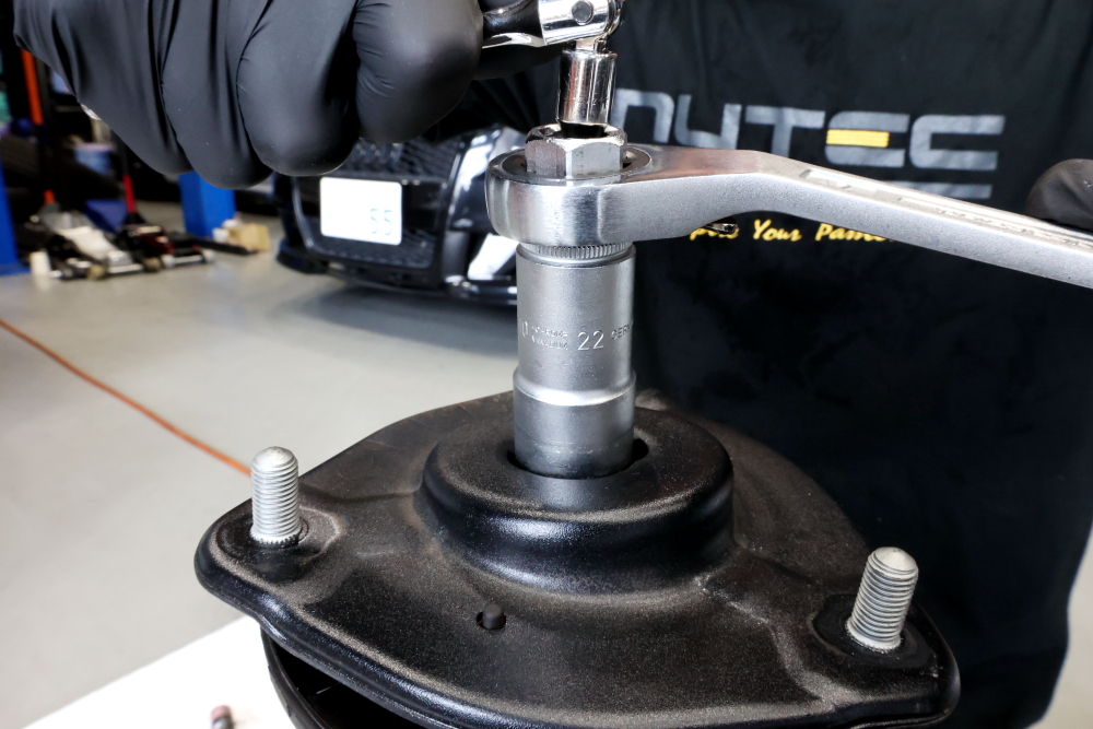 純正のアッパーマウントは再利用して、KW専用ツールで丁寧に締め付けを行います。