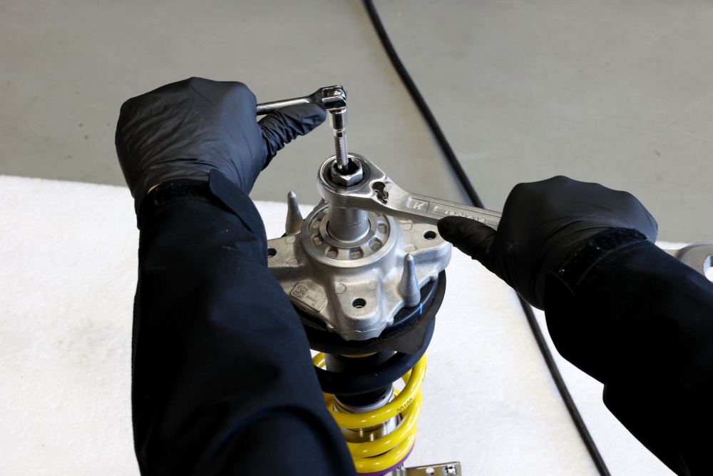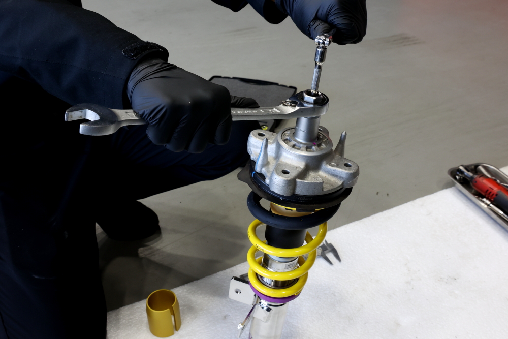 純正アッパーマウントは再利用してKW専用ツールで丁寧に組み付けを行います。