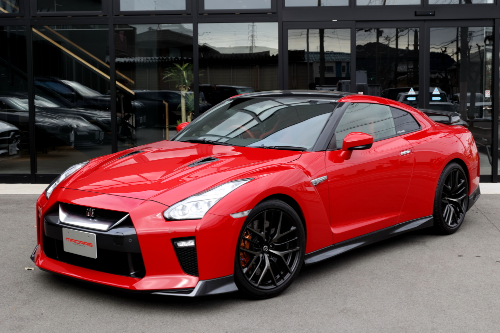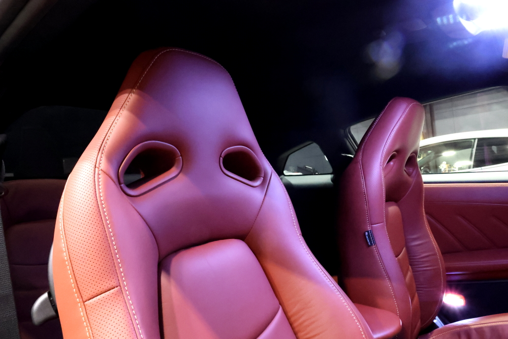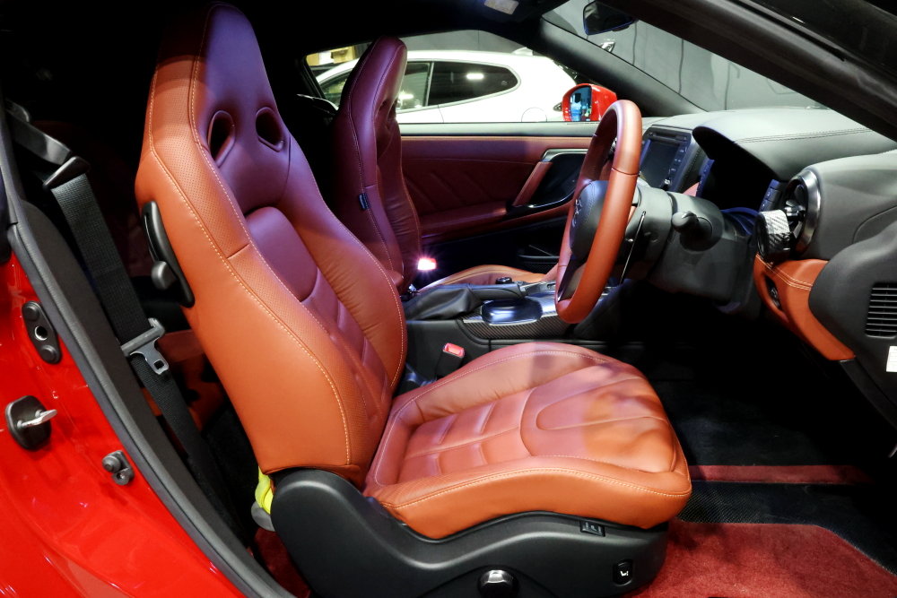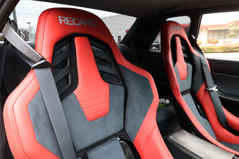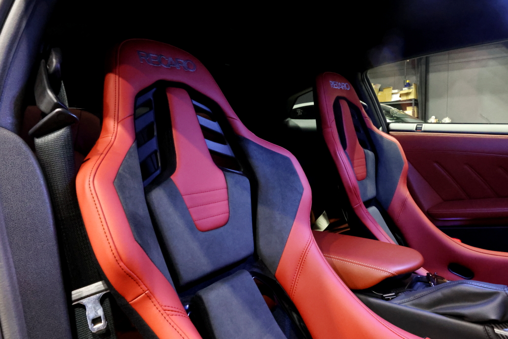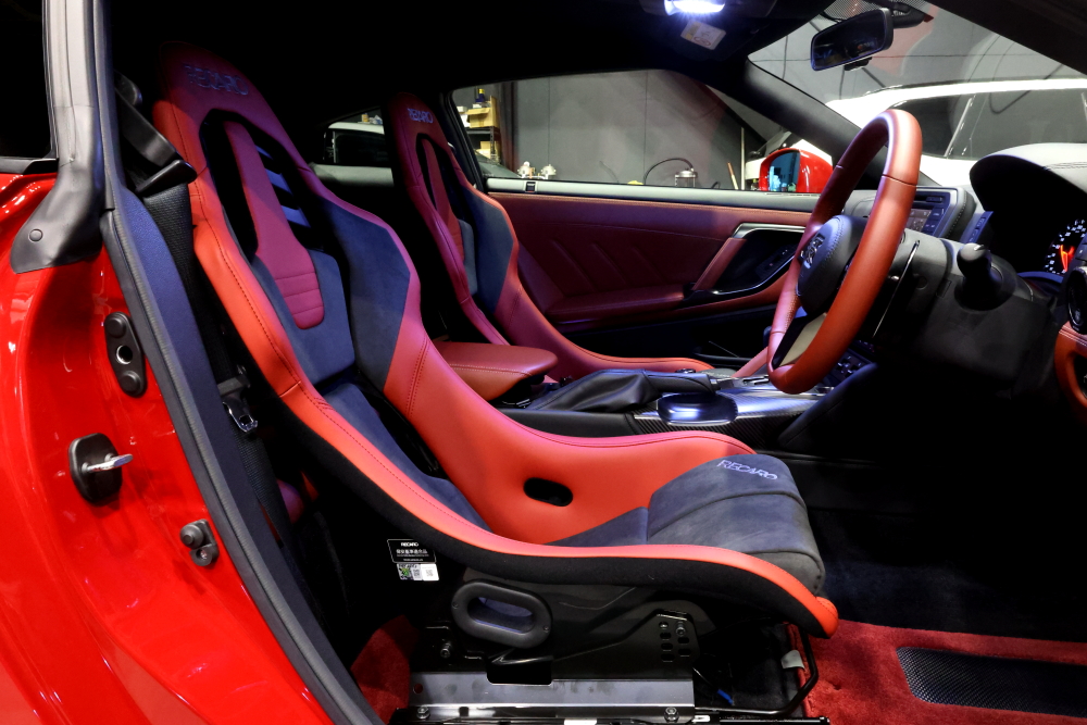 まずは現行のR35 GT-R。 ボディカラーに合わせたレッドのインテリアに、RECARO RSS UTのシャープな造形が完璧に調和しています。
