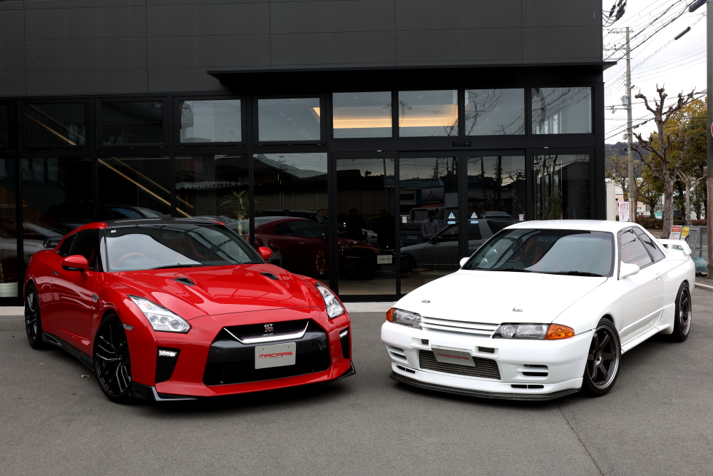 最後にショップ前で2台揃っての2ショット。 それぞれの世代で頂点を極めた2台に、同じモデルのバケットシートが収まる姿は、オーナー様のこだわりが凝縮された最高の眺めです。