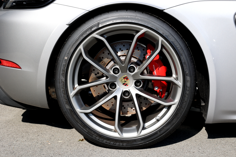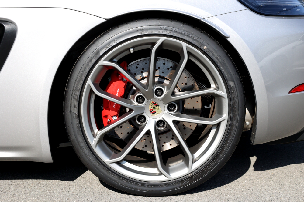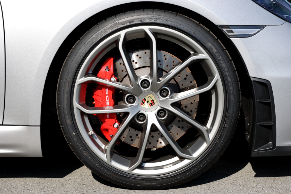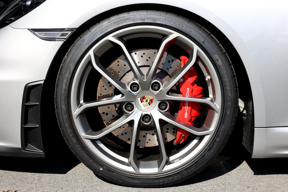 足回り: サテンフィニッシュのホイールに覗くレッドキャリパーが、ポルシェらしいスポーツマインドを主張。