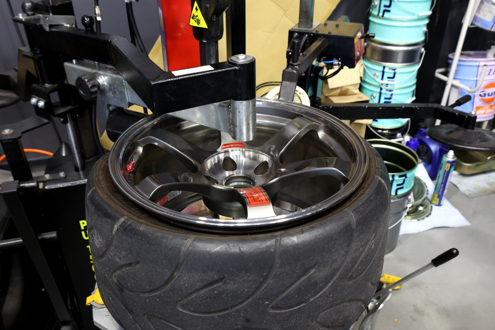 作業はリフトアップ状態から始まり、古いタイヤ(ADVAN A052)からの組み替え、バランス調整を丁寧に行いました。